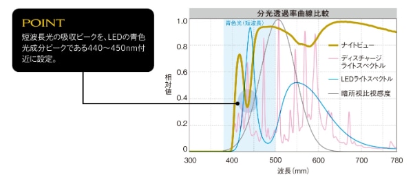 光を抑えながら、暗所視比視感度の高い波長510nmの透過を高めることで